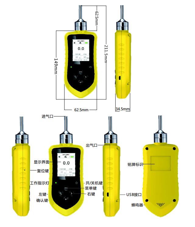 顯示內(nèi)容 | 型號(hào)、氣體名稱、量程、單位、實(shí)測(cè)值、溫度、濕度、時(shí)間、電池 剩余量、吸氣泵、聲音、報(bào)警狀態(tài)、溫馨文字提示等 | ||